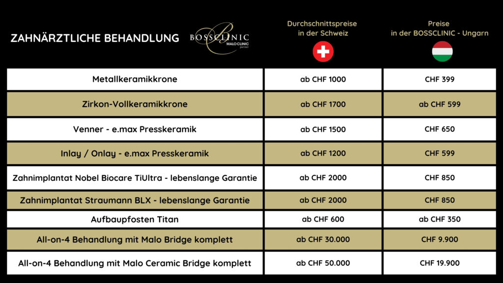 Die Kosten einer umfangreichen Zahnbehandlung liegen wesentlich unter den Durchschnittspreisen in der Schweiz. In der unteren Tabelle haben wir die Durchschnittspreisen in der Schweiz und unsere Preise bei BOSSCLINIC verglichen.